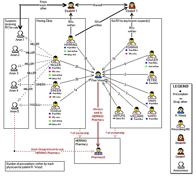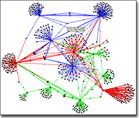 Die beiden folgenden Visualisierungen wurden mit dem Analyst's Notebook erstellt und zeigen Telefonanrufe verdächtiger Personen und Beziehungen in einem Versicherungsbetrugsfall.
